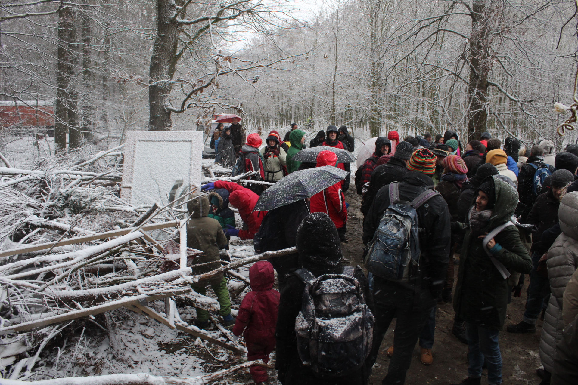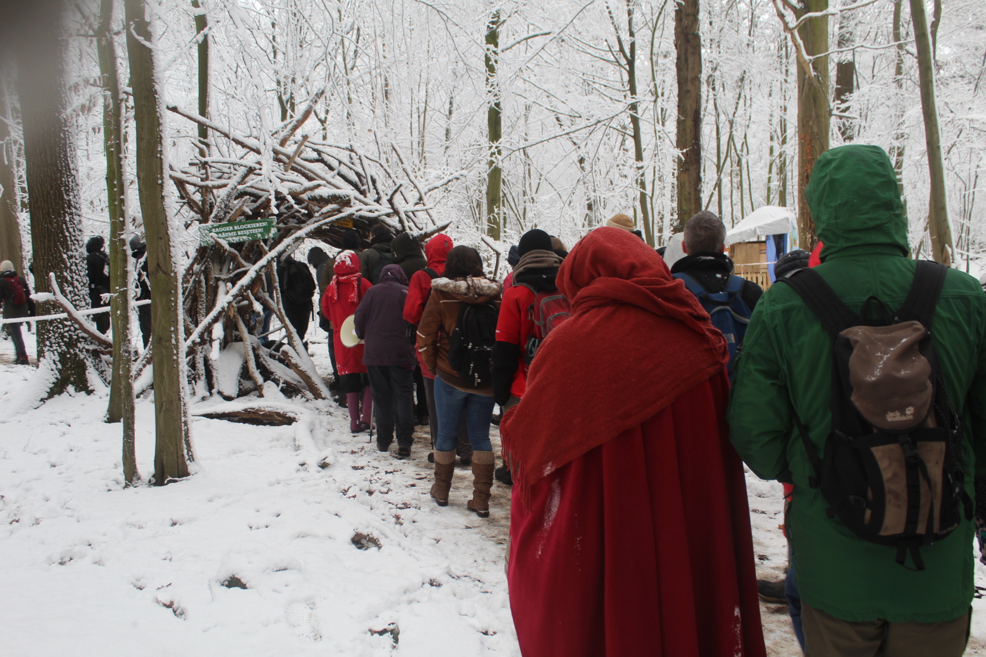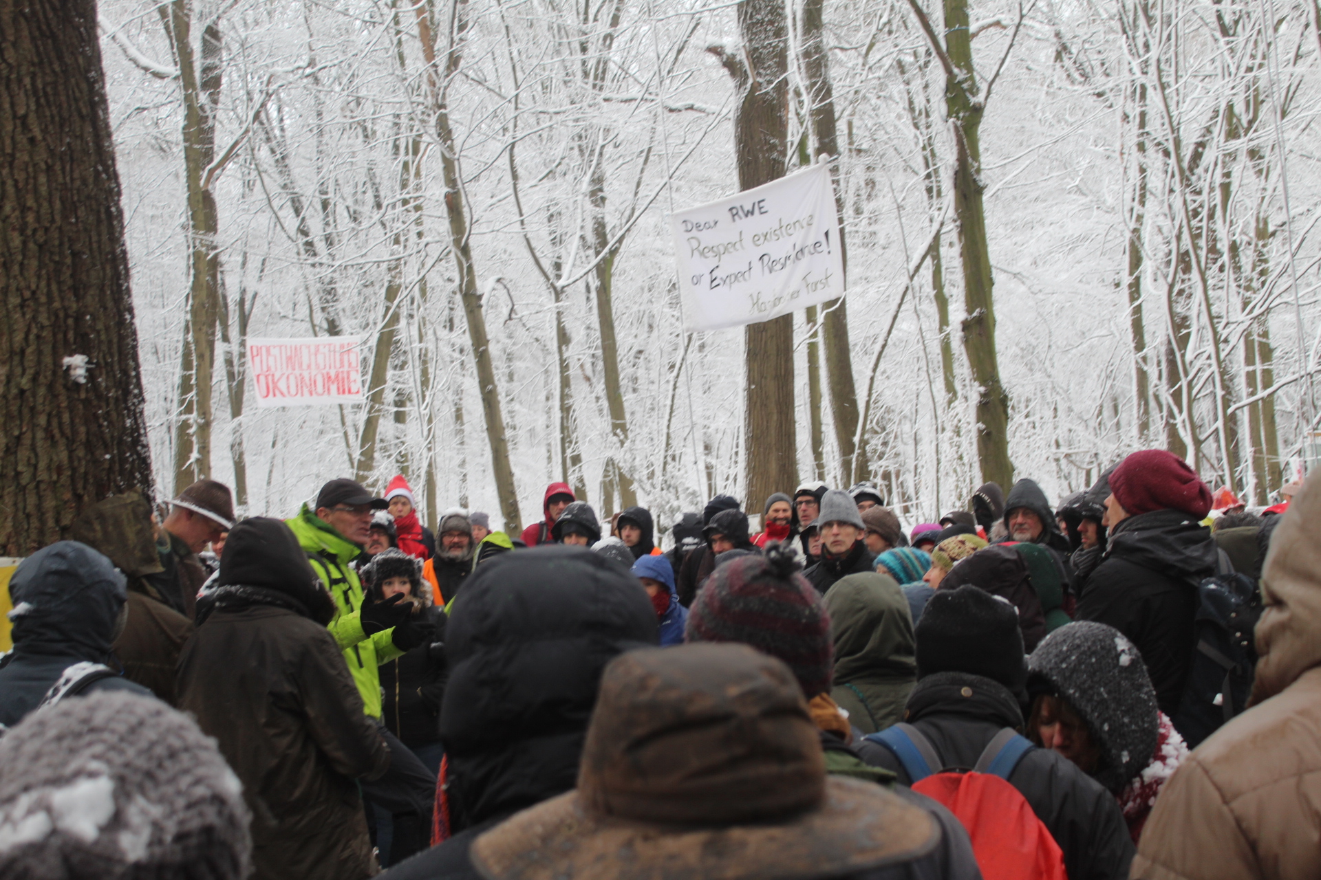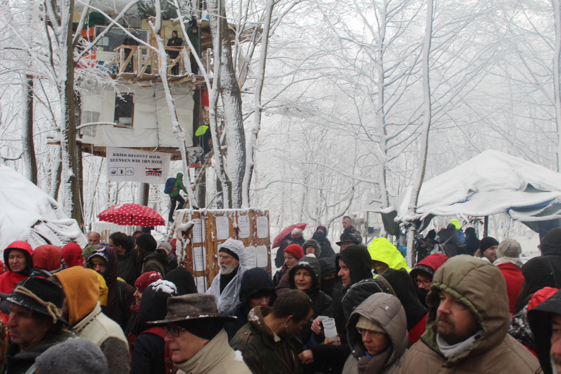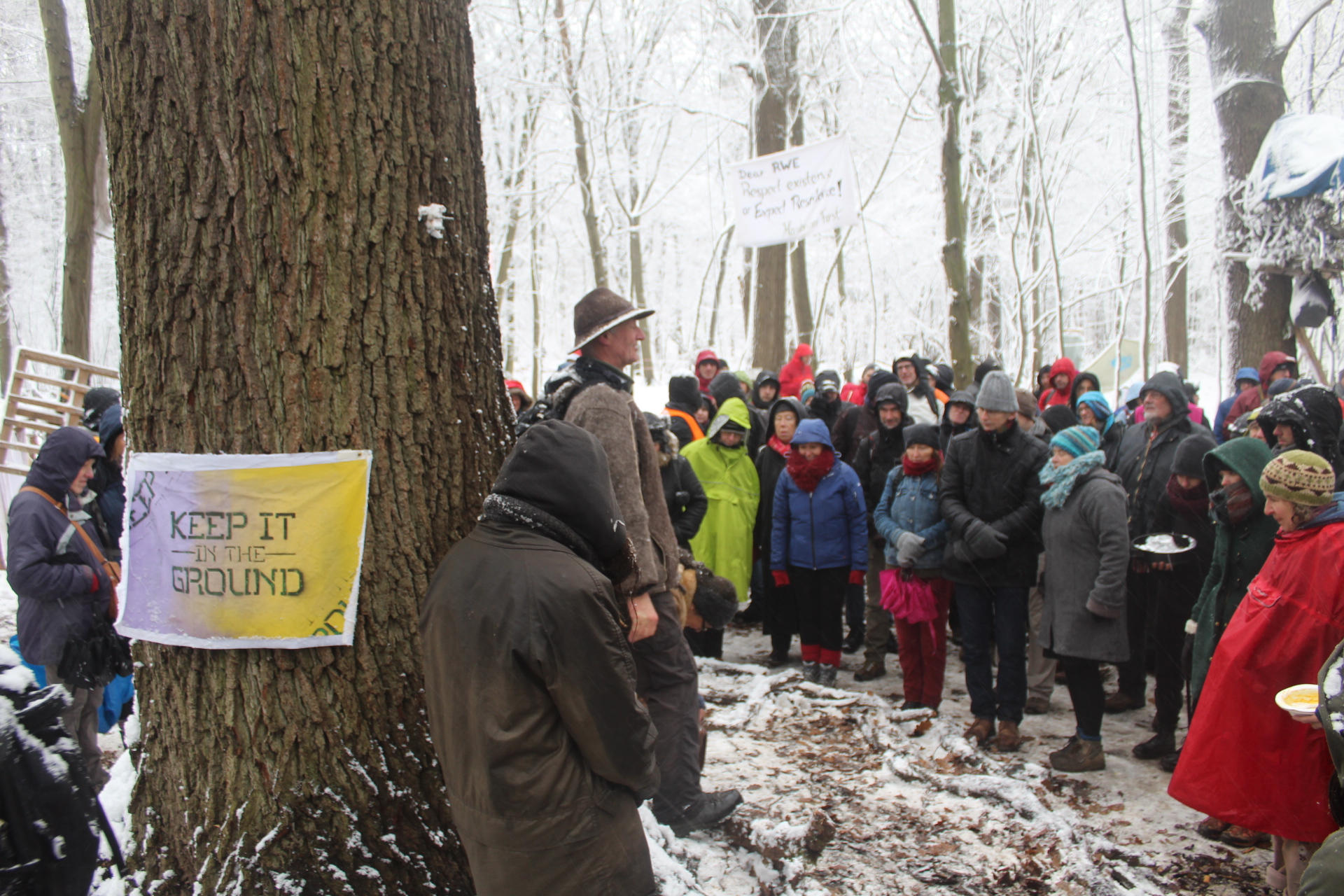 Today’s walk in the Forest has attracted over 400 people reflecting a wave of popular support sweeping not just the region but all of Germany and from around the world. This is happening at the time when the rulling parties are no loger able or willing to hold an argument on exiting from coal and its effects on the climate but istead have become an extension of RWE special interests and are trying to redirect attention and justify large police actions to destroy the last of Hambi by talk of extremism and violence. All as an attempt to criminalize the whole climate justice movement employing such pesky tactics as road blockades and locking on to planet and climate destroying equiment. Many supporters realized that this is one of the last chances to see the world unique bionome of Hambacher Forest in its present shape if at all. They have expressed their gratitude by sharing home-baked cakes, lots of other food, warm clothing and other supplies with the unarmed “extremists” most of whom do not have firearms training both of which can not be said for the hundreds of armed cops that will arrive in Hambach to help RWE destroy the forest despite wide-spread opposition bringing a reality of climate unstability that in a logic so typical of disaster-capitalism is in turn used to justify further progressive militarization of police forces and higher levels of repression.
