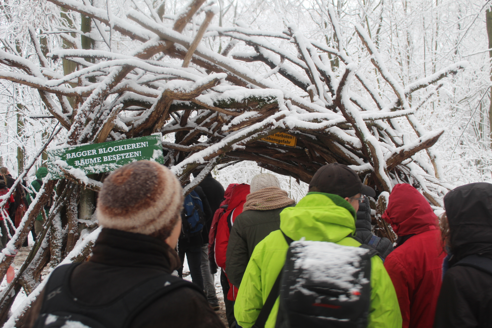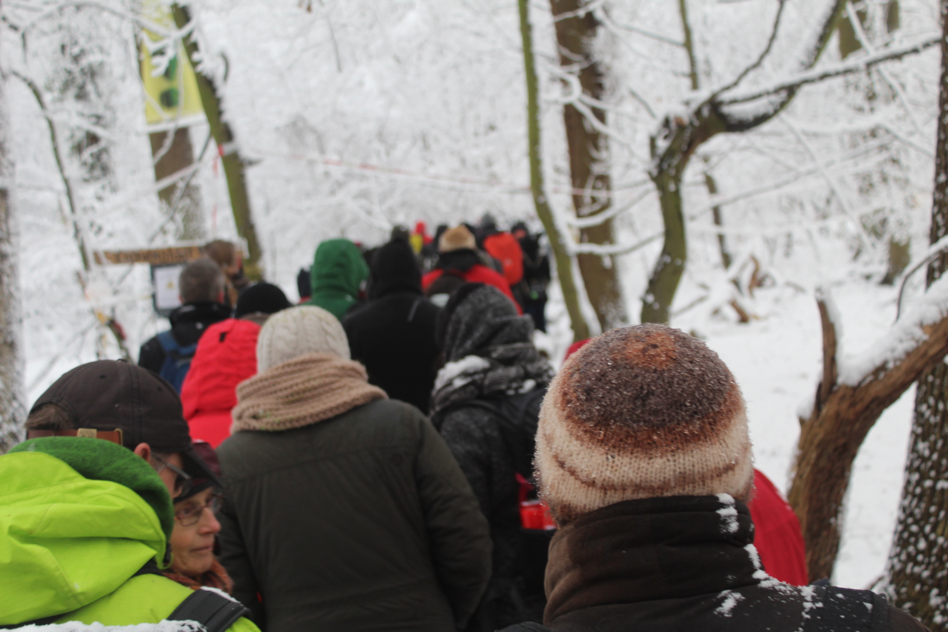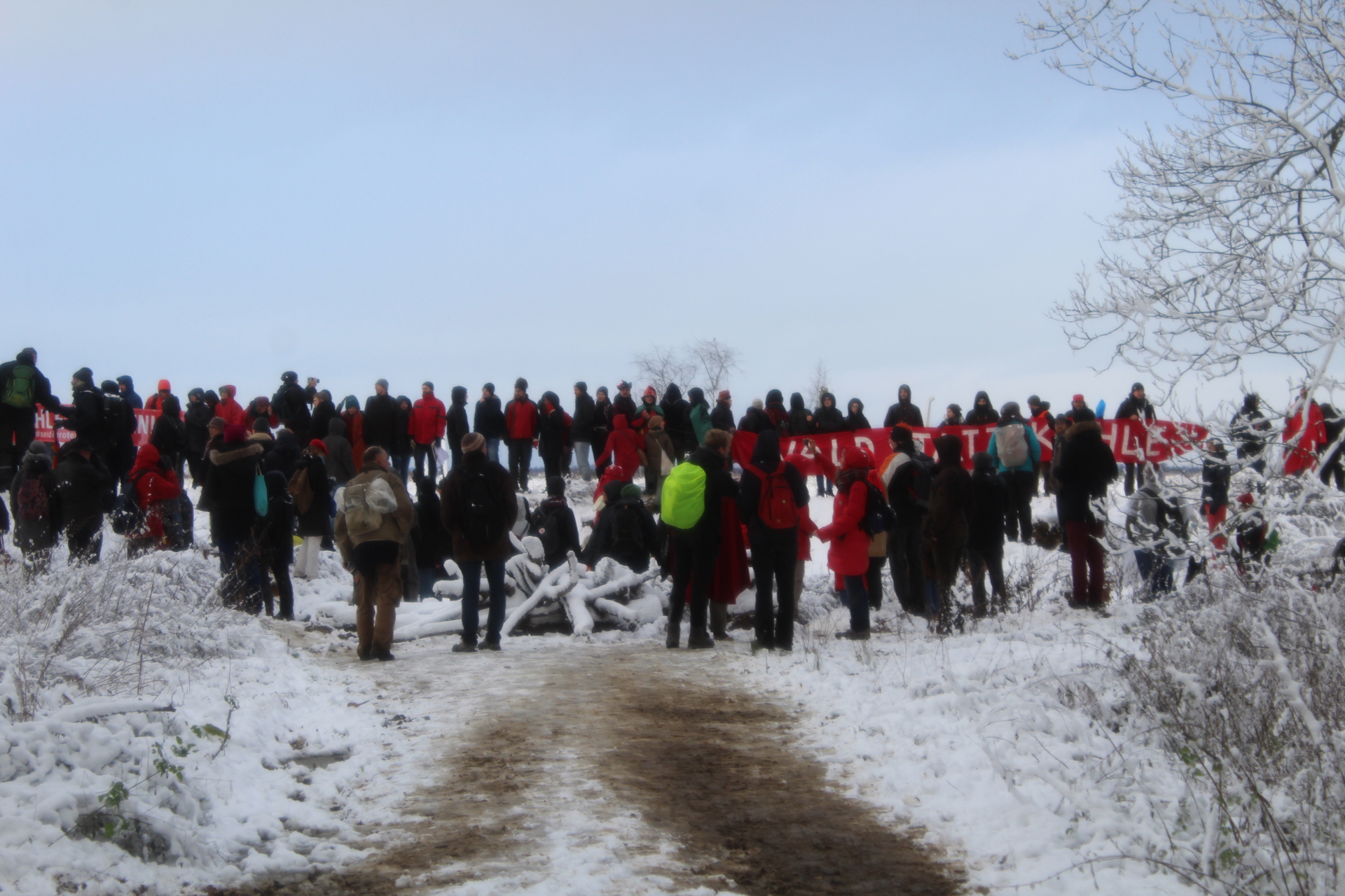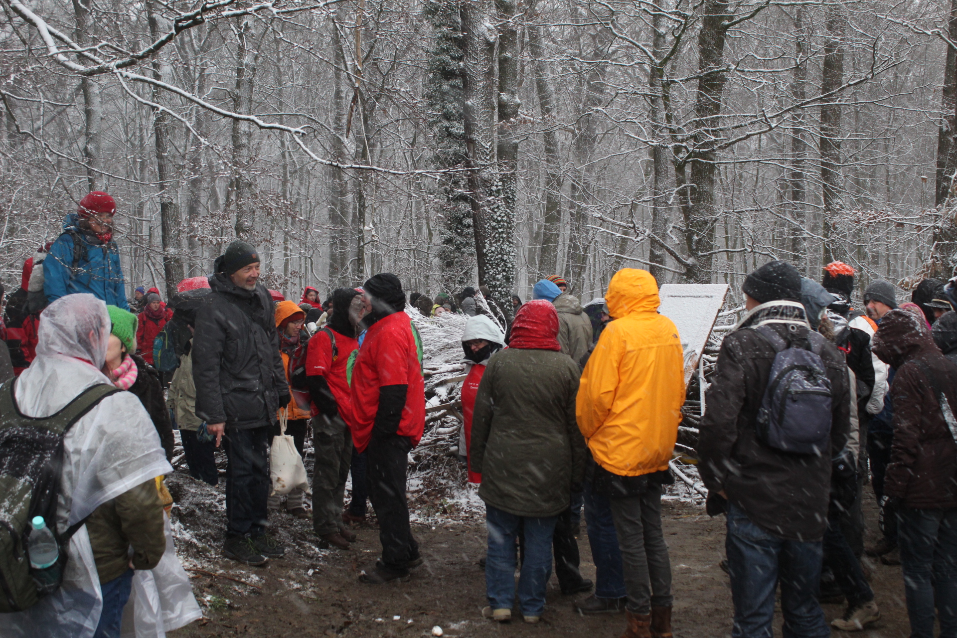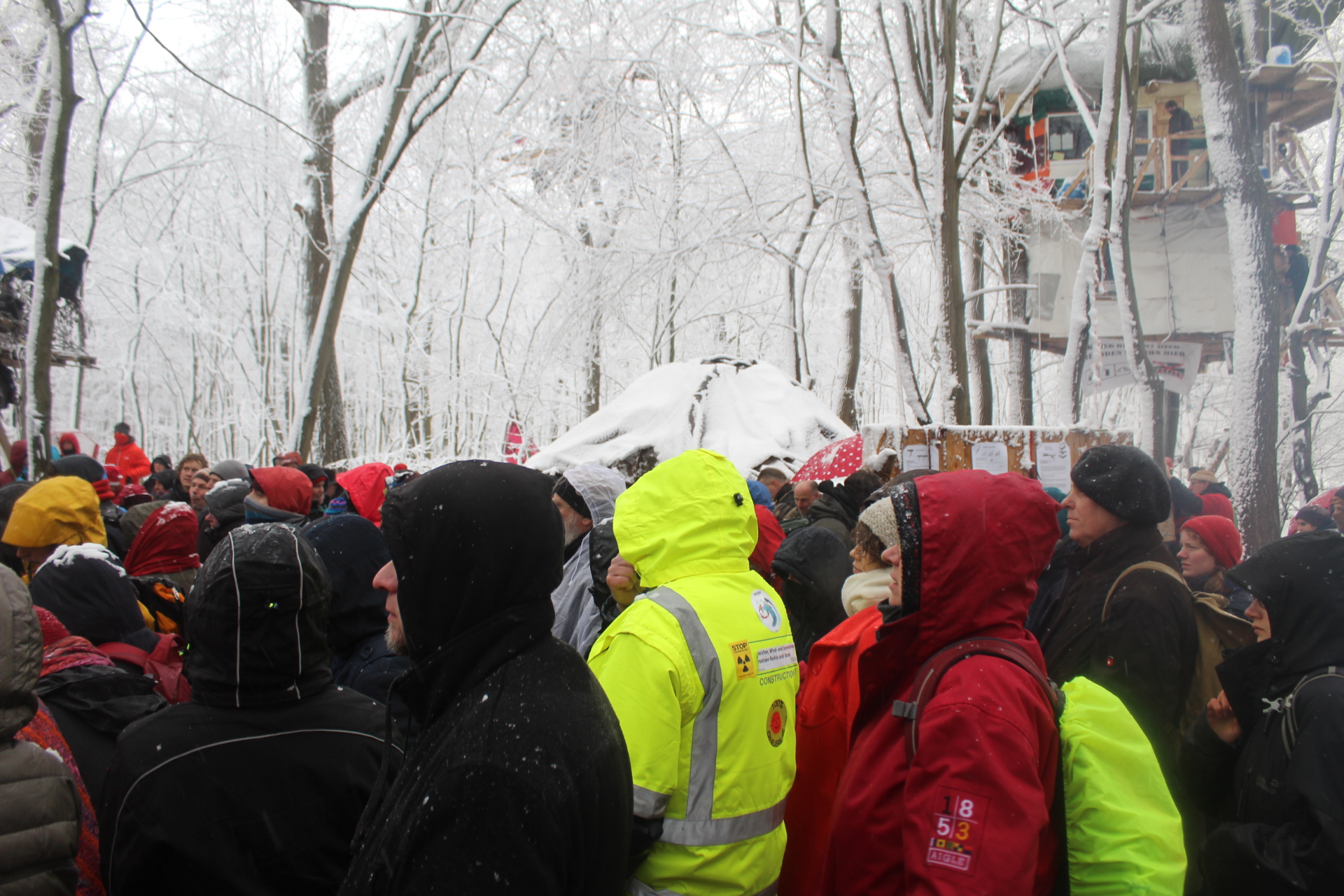 Today’s walk in the Forest has attracted over 400 people reflecting a wave of popular support sweeping not just the region but all of Germany and from around the world. This is happening at the time when the rulling parties are no loger able or willing to hold an argument on exiting from coal and its effects on the climate but istead have become an extension of RWE special interests and are trying to redirect attention and justify large police actions to destroy the last of Hambi by talk of extremism and violence. All as an attempt to criminalize the whole climate justice movement employing such pesky tactics as road blockades and locking on to planet and climate destroying equiment. Many supporters realized that this is one of the last chances to see the world unique bionome of Hambacher Forest in its present shape if at all. They have expressed their gratitude by sharing home-baked cakes, lots of other food, warm clothing and other supplies with the unarmed “extremists” most of whom do not have firearms training both of which can not be said for the hundreds of armed cops that will arrive in Hambach to help RWE destroy the forest despite wide-spread opposition bringing a reality of climate unstability that in a logic so typical of disaster-capitalism is in turn used to justify further progressive militarization of police forces and higher levels of repression.