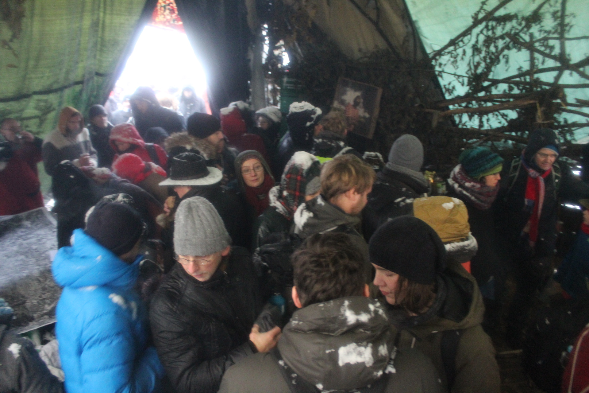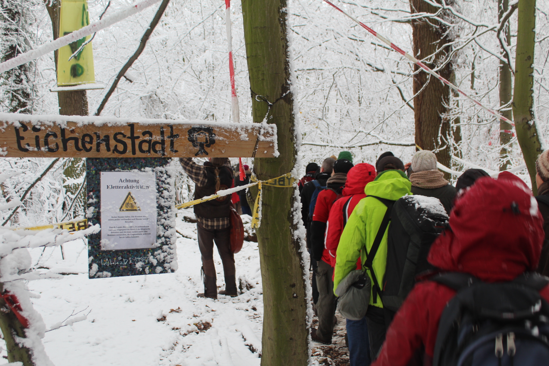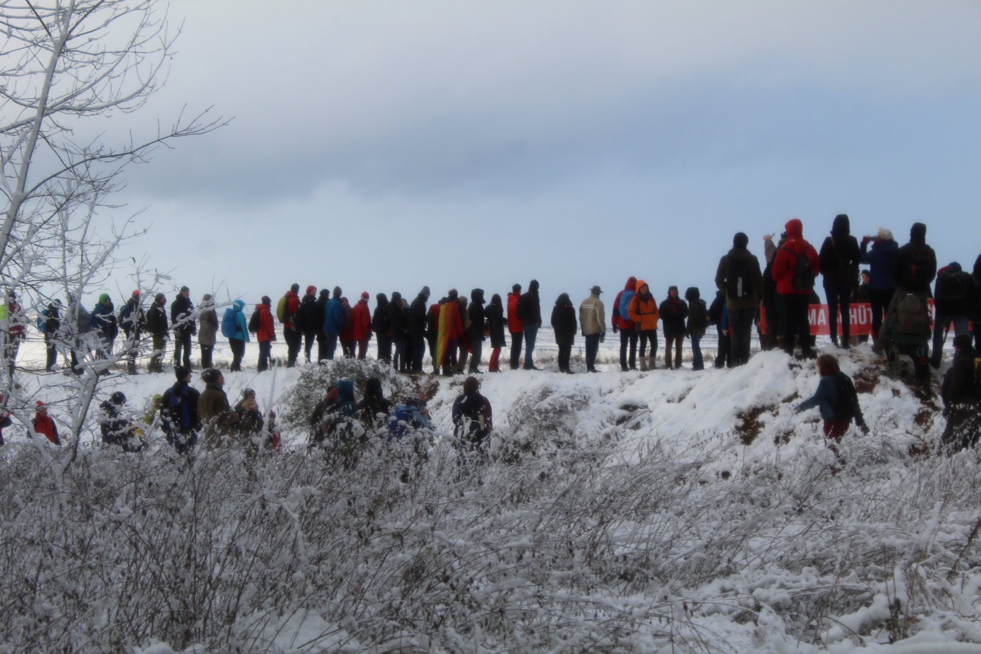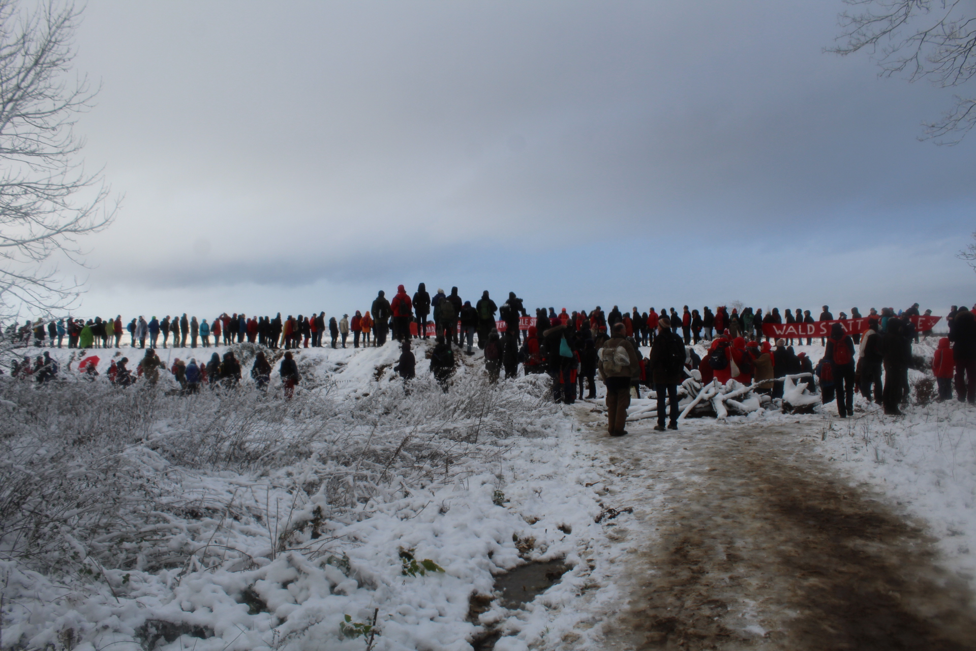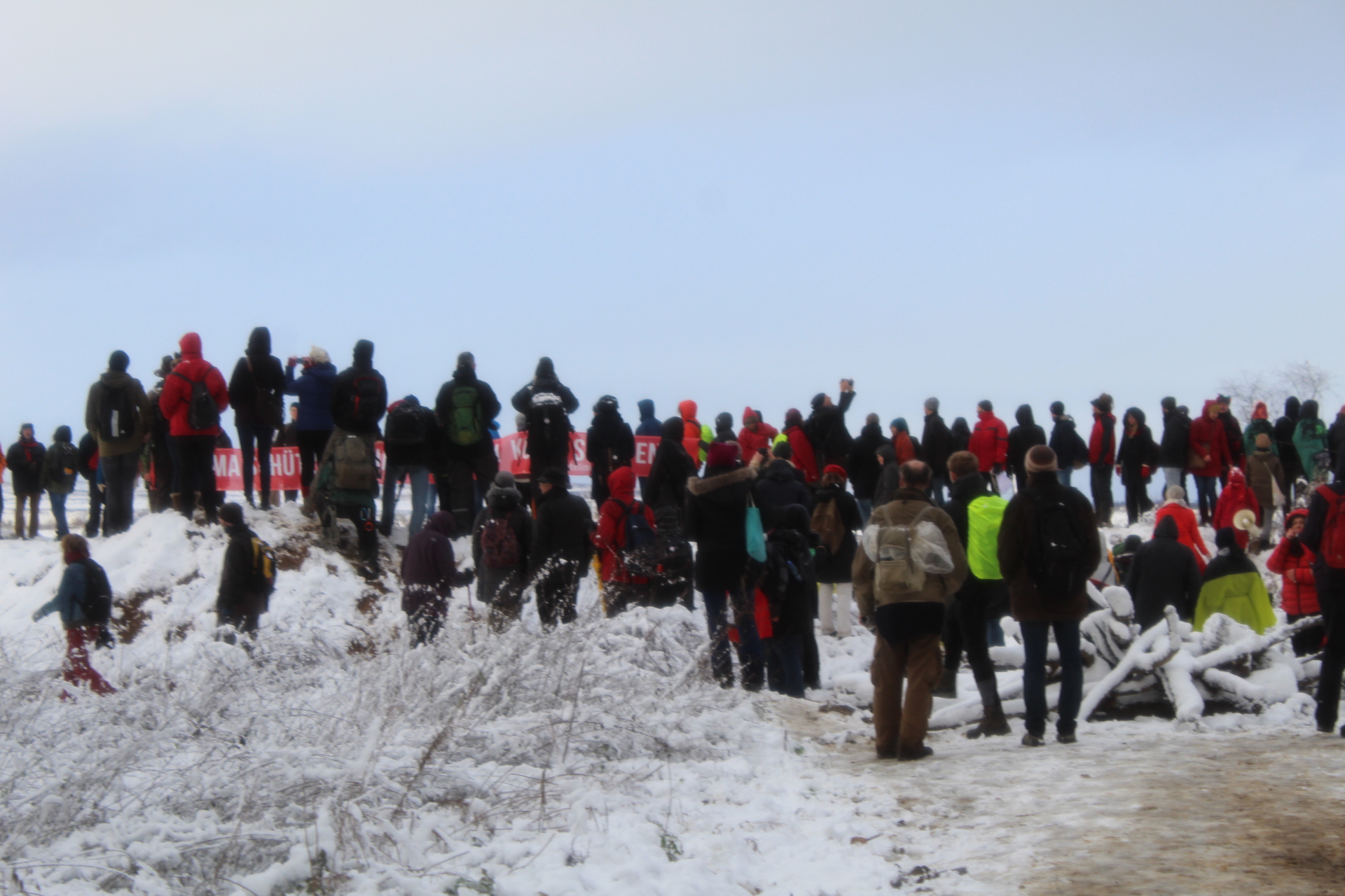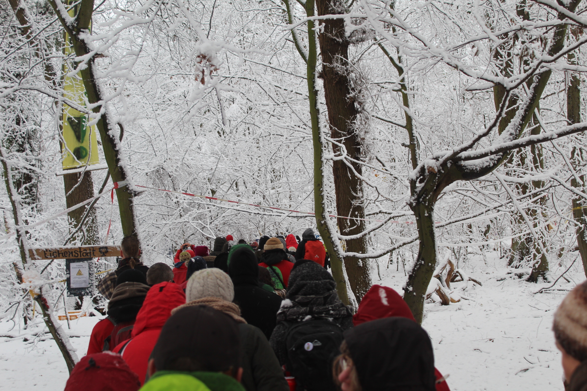 Today’s walk in the Forest has attracted over 400 people reflecting a wave of popular support sweeping not just the region but all of Germany and from around the world. This is happening at the time when the rulling parties are no loger able or willing to hold an argument on exiting from coal and its effects on the climate but istead have become an extension of RWE special interests and are trying to redirect attention and justify large police actions to destroy the last of Hambi by talk of extremism and violence. All as an attempt to criminalize the whole climate justice movement employing such pesky tactics as road blockades and locking on to planet and climate destroying equiment. Many supporters realized that this is one of the last chances to see the world unique bionome of Hambacher Forest in its present shape if at all. They have expressed their gratitude by sharing home-baked cakes, lots of other food, warm clothing and other supplies with the unarmed “extremists” most of whom do not have firearms training both of which can not be said for the hundreds of armed cops that will arrive in Hambach to help RWE destroy the forest despite wide-spread opposition bringing a reality of climate unstability that in a logic so typical of disaster-capitalism is in turn used to justify further progressive militarization of police forces and higher levels of repression.